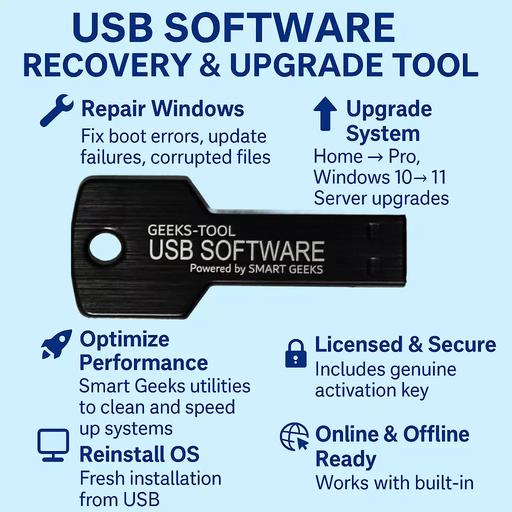 The Smart Geeks LLC® USB Software Recovery & Upgrade Tool is more than just an installer—it’s a complete solution designed for home users, IT technicians, and businesses that need to keep their systems running at peak performance.